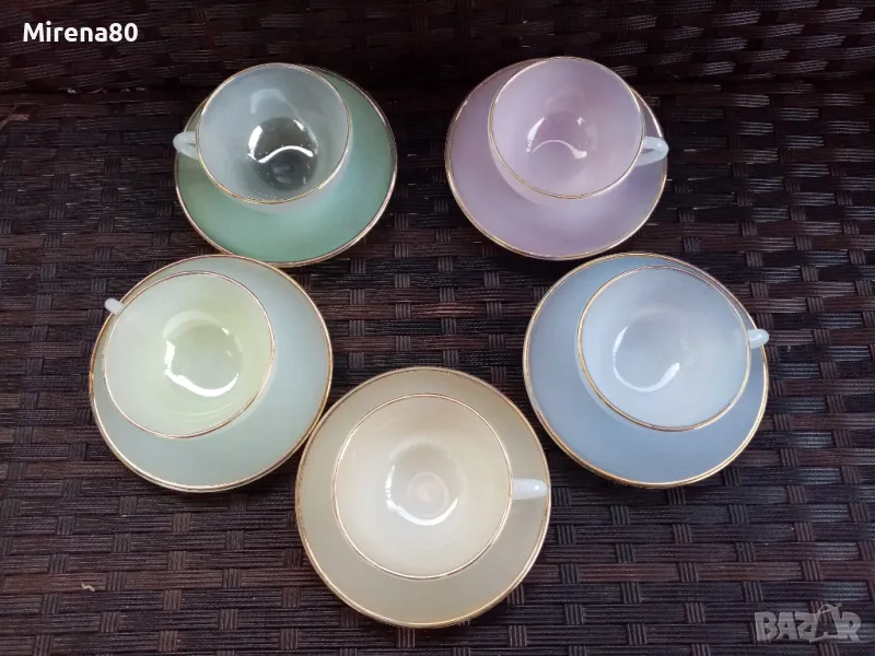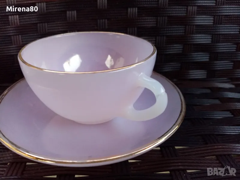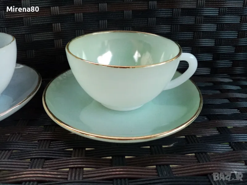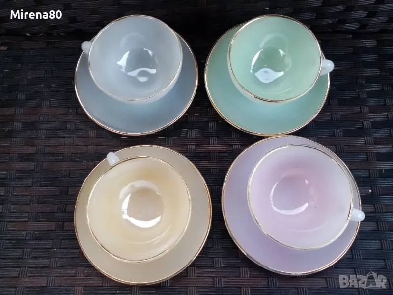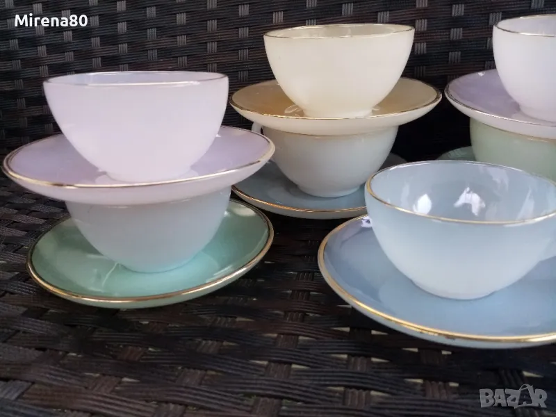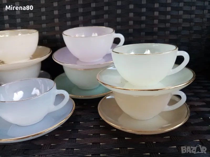 Стар френски аркопал в разкошни млечни цветове. Чашите са 2 размера с лека разлика. Много нежни и красиви ! С минимални следи от времето по златния кант на някои чинийки. Маркировка топъл печат.