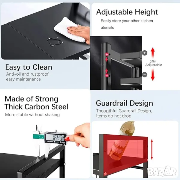 ПОДОБРЕНАТА ВЕРСИЯ Е ЗДРАВА Двуслойна поставка за микровълнова фурна, изработена от въглеродна стомана, тежка и дебела въглеродна стомана, също боядисана с еко черна боя, устойчива на топлина и ръжда. Поставката за микровълнова фурна може да издържи до 30 kg (66 lb). Две опорни пръти са заварени в предната рамка от двете страни. Стелажите са достатъчно здрави, за да поберат микровълнови печки и други кухненски прибори, като прибори за хранене, подправки, консерви, подправки, бутилки, чинии, тенджери и тигани.