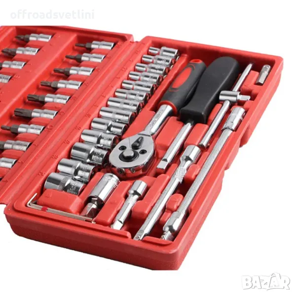 Практичен комплект от 46 части накрайници, вложки, тресчотка, в удобен пластмасов куфар за пренос. Подходящи за употреба при различни видове ремонтни работи в сервизи или у дома.