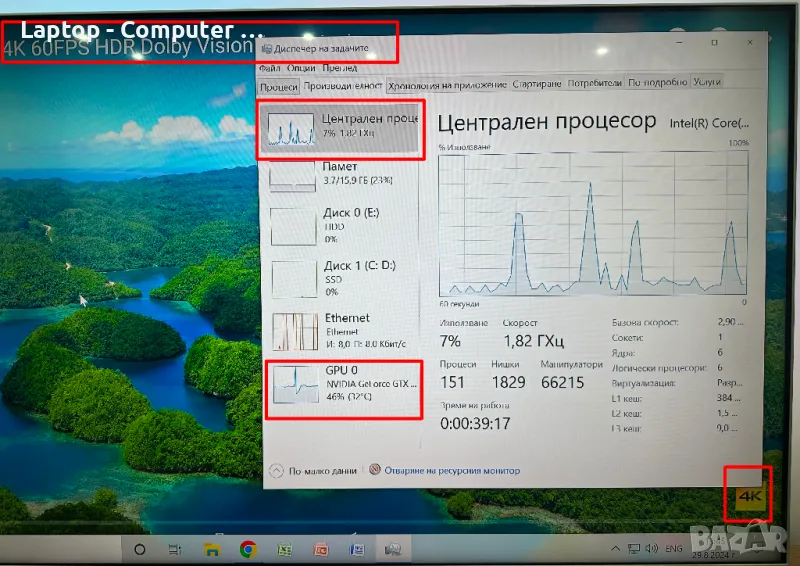 10 64bit с всички нужни програми и драйвери и готов е за използване. При гледане на 4K Ultra филми на цял екран процесора се натоварва до 7-10% и видео картата не вдига повече от 32градуса и не се нотоварва повече от 45%