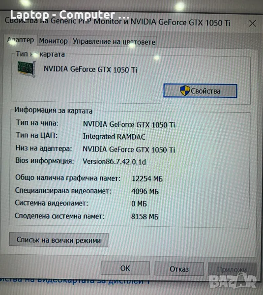 Видео карта: Nvidia GeForce GTX 1050Ti 4GB обща графична памет 12GB