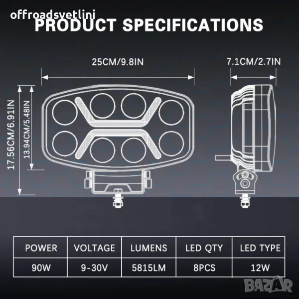 LED мощен диоден фар халоген лампа 12V-24V 180W бяло-жълто за АТВ джип камион трактор земеделски и селскостопански машини и др.