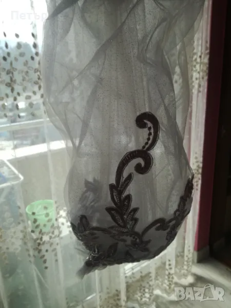 Роклята е елегантно-официална,чисто нова.Към нея има и ръкавели и презрамки ,който може да се нося по желание.Размера по етикет е-L.,а размерите измерени от мен са-дълж.от бюстието до долу е-1м.и 38см,дълж. на ръкавели-47см.,шир.на талията-свободно-2х32см.,апри разширен ластик е-2х38см.