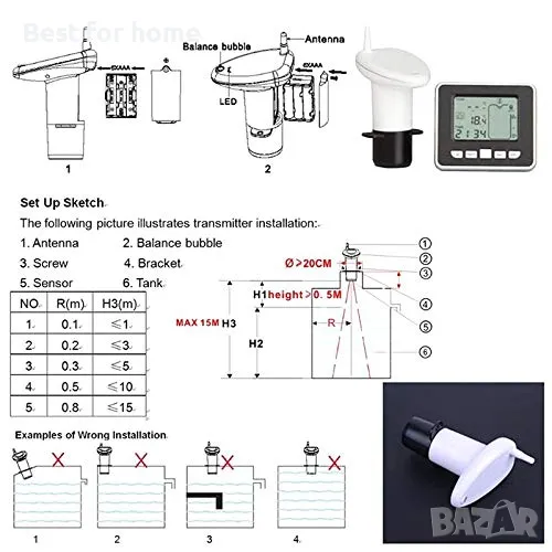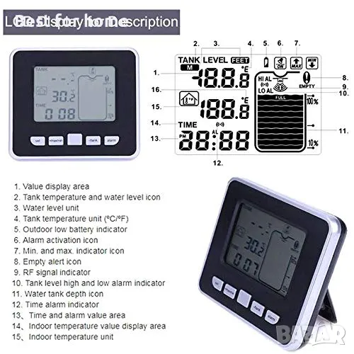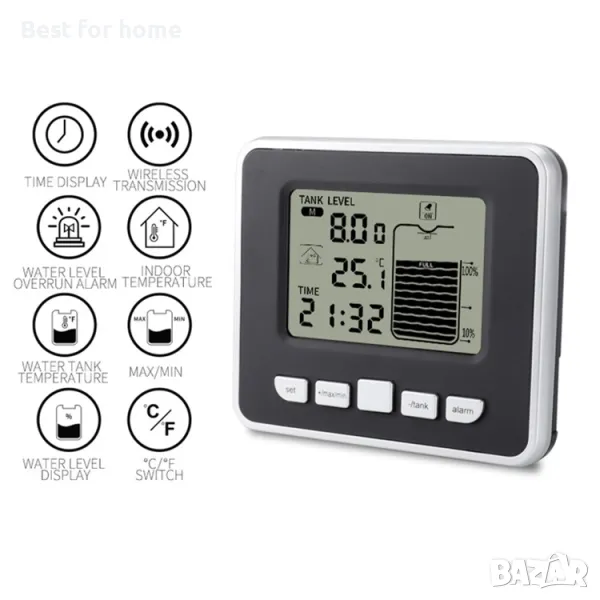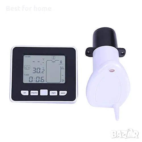 Висококачествен безжичен сензор за ниво на течности, използван за дъждовна вода и резервоари за вода. Позволява удобно наблюдение на нивото на течността в резервоара, без да напускате дома. Сензорът осигурява пълна безопасност, тъй като информира потребителя за нивото на течността в реално време. Четенето на данните е изключително лесно, благодарение на лесен за четене дисплей с лесен за използване интерфейс.