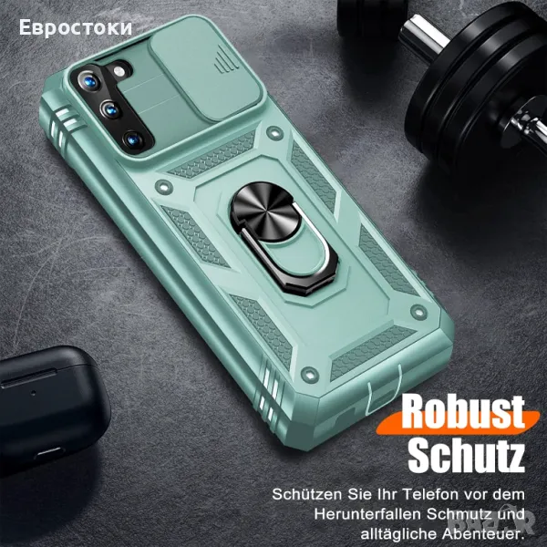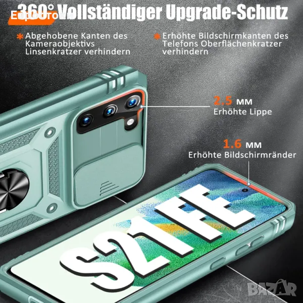 Защита от военен клас: калъфът Galaxy S21 FE 5G използва уникален край TPU в комбинация с вградени капачки за компютър 2-в-1, за да защити телефона ви от изпускане, драскотини и удари. Защита от военен клас с технология за въздушна възглавница осигурява пълна защита за вашето оборудване. Дизайн на плъзгач на обектива Повдигната рамка за защита на камерата. Капачката покрива обектива и предпазва обектива от прах и надраскване.