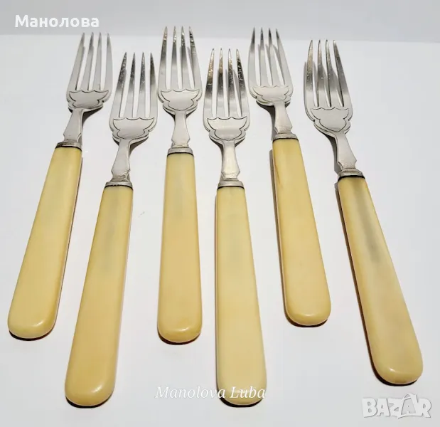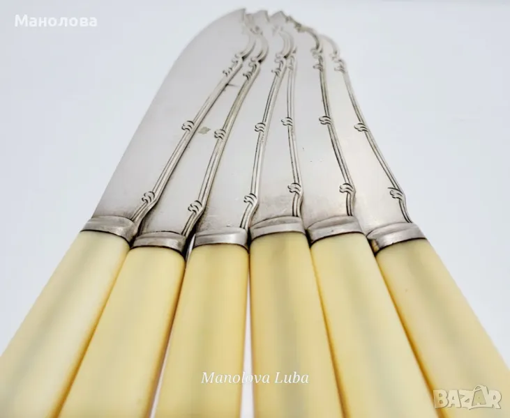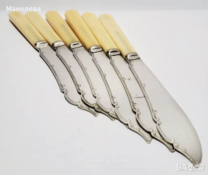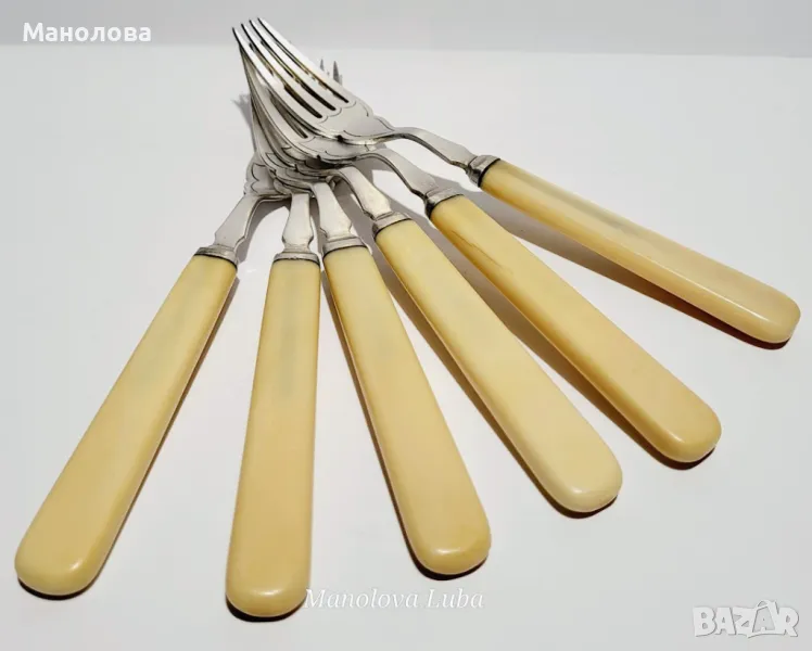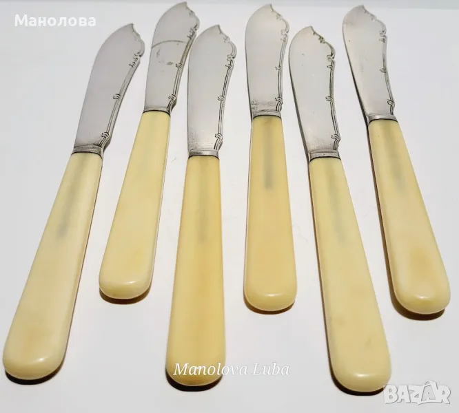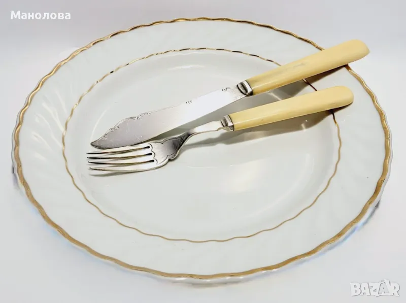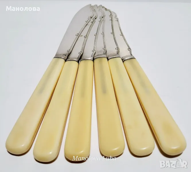 Дълбоко посребрени с кокалени дръжки, приборите са в добро антикварни състояние. Предвидени за сервиране на риба, но може да се използва за други храни.