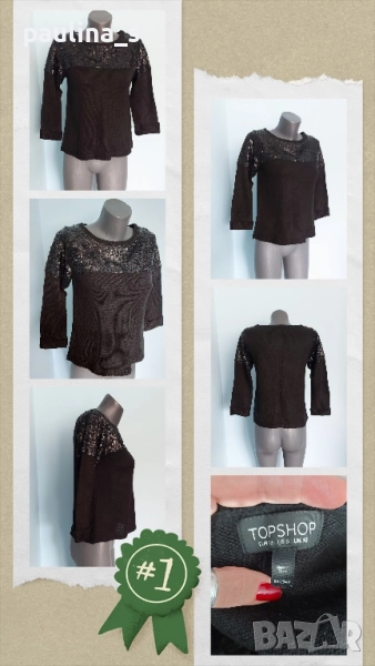 2️⃣. Колаж / M / 2XL - "Topshop". Цената е крайна, без пазарлъци 19,99лв / 10 евро. Дамски пухкав пуловер с пайети в горната част. Моделът е обран и с леко втален силует, 7/8 ръкави с маншети, стил Коко