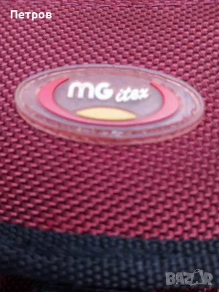 Чантичка за документи MGitex, цвят бордо; с ремък за през рамо, но и с дръжка за ръка; две отделения - основно, с черна закопчалка; предно - с цип, вътре също разделено на две. Горе има малък цип за нещо дребно - малка запалка, монети... презрамката се маха по желание с две устройства, подобни на ключодържатели. размери - вис. 16 см; шир. 10; дълб. 5 см. Размерите са относителни - като се сложи нещо, тя се разтяга и увеличава.