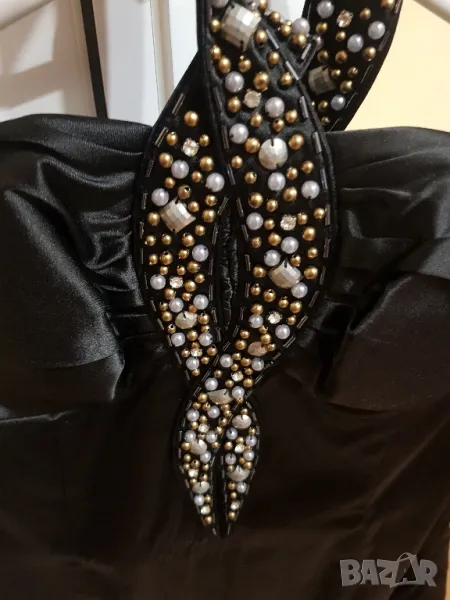 Дамска елегантна рокля в черно, с хастар. Закопчаването е с ефектна перлена ивица, която обгръща врата и се закопчава отзад с копче. Цип отстрани. Има вградени подплънки.