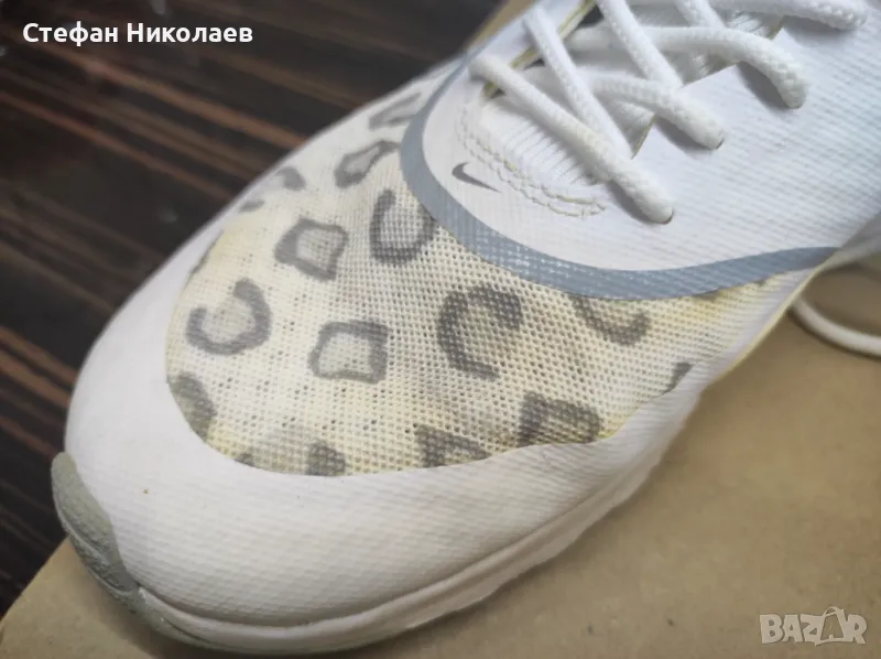 Nike Air max Thea. Стелката е 25,5 сантиметра. Снимал съм забележките: оцветяване на плата и скъсано зад петата.