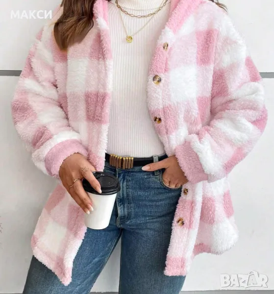 Макси атрактивно пухено изключително меко и комфортно горнище с качулка и копчета в модерно каре