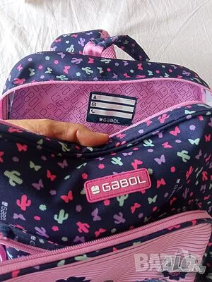 Ученическа раница GABOL. Без забележки, височина 44 см, ширина 32 см, дъно 13 см. С две големи прегради и една малка.