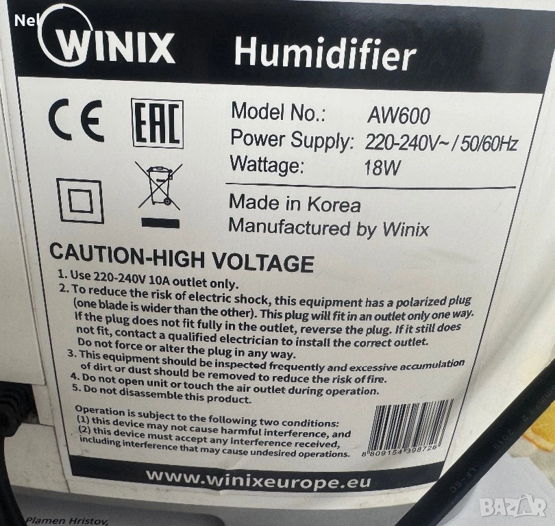 Продавам овлажнител Winix AW600, ползван около 9 месеца. Това е безшумен овлажнител и пречиствател за въздух с тройно действие ("air washer"), предназначен да подобри качеството на въздуха в помещения до около 55 m². Едновременно овлажнява и почиства въздуха чрез 3-степенна система за пречистване, разгражда замърсители, вируси, бактерии, химически изпарения и миризми на молекулярно ниво, спомага за разпаднето на вируси, бактерии, гъбички и акари.