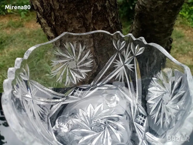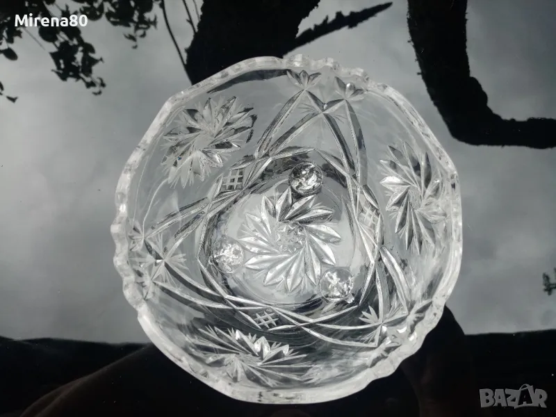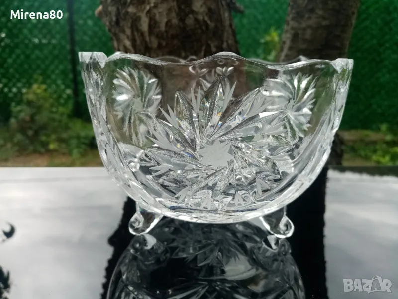 Разкошна купа оловен кристал, средна големина - диам. 14, вис.9 см. Подходяща както за дребни плодове, така и за ядки или бонбони. Ефектен дизайн на крачета с вълнообразен ръб, много красива и богата гравюра. Отлично състояние !
