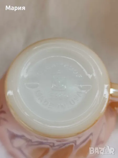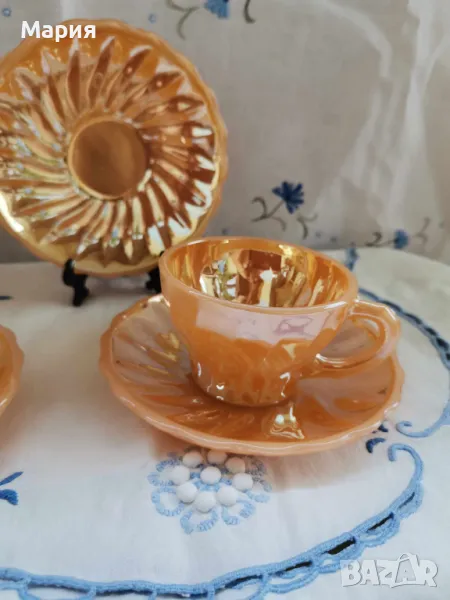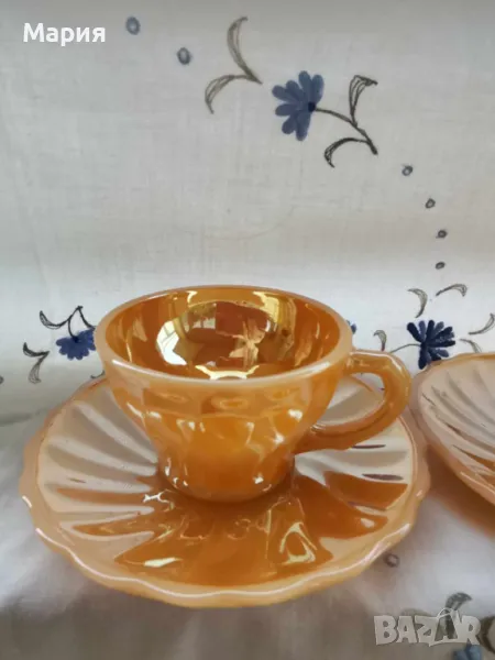 Зашеметяващи чаши за кафе от висок клас пресовано стъкло, със седефен оттенък, Производството е от 50-те години на миналия век. Цвят нежна праскова. Вместимост чашка 100мл.,диаметър чинийка 12см. Налични са 6 броя сета. Маркировка Anchor Hocking USA