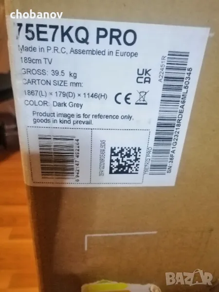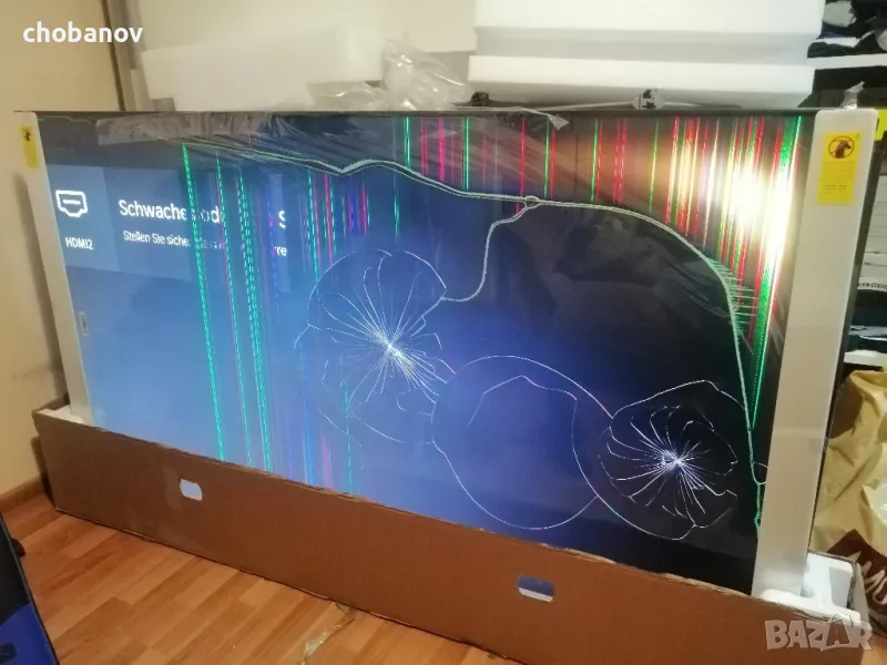 Телевизорът е закупен на търг от Германия, видимо е чисто нов, но с ударена матрица. В комплект с кашон, стойка, дистанционно, кабели. 75 инчов модел с доста добри характеристики. Има логото на Евро 2024.