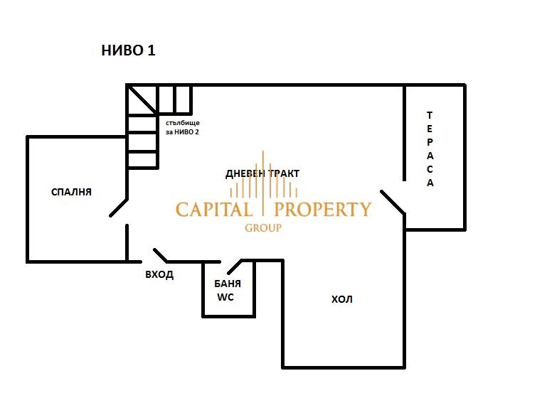 Ниво 1: дневен тракт около 30 кв.м., спалня около 12 кв.м., тераса - около 6 кв.м, комбиниран санитарен възел, стълбище към ет.2