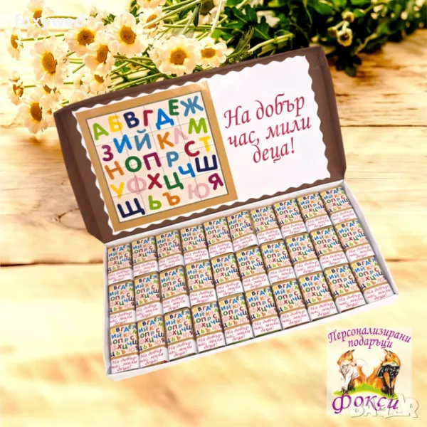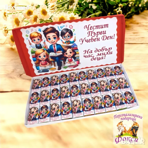 30 броя индивидуално опаковани шоколадови бонбони за първи учебен ден, с надпис „На добър час, мили деца“. Чудесен начин да изненадате децата в този така вълнуващ ден.