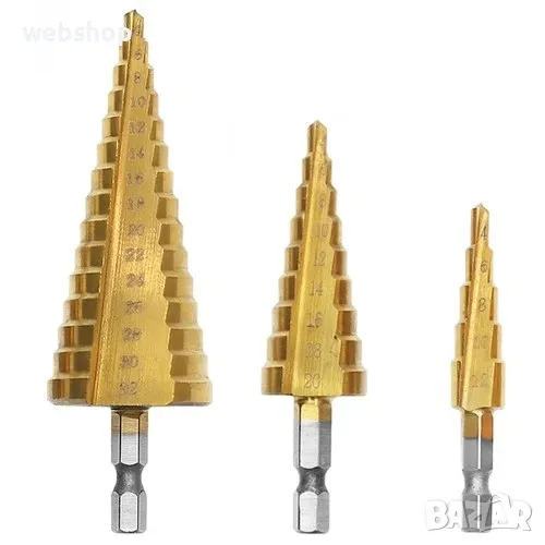 Комплект конусовидни стъпкови свредла за прецизно пробиване на кръгли дупки в тънкостенни стоманени листове, пластмаси, металообработване и др. Стъпковите свредла ще намерят приложение в шлосерството, тенекеджийството, инсталацията, както и в домашната работилница за дребни работи.