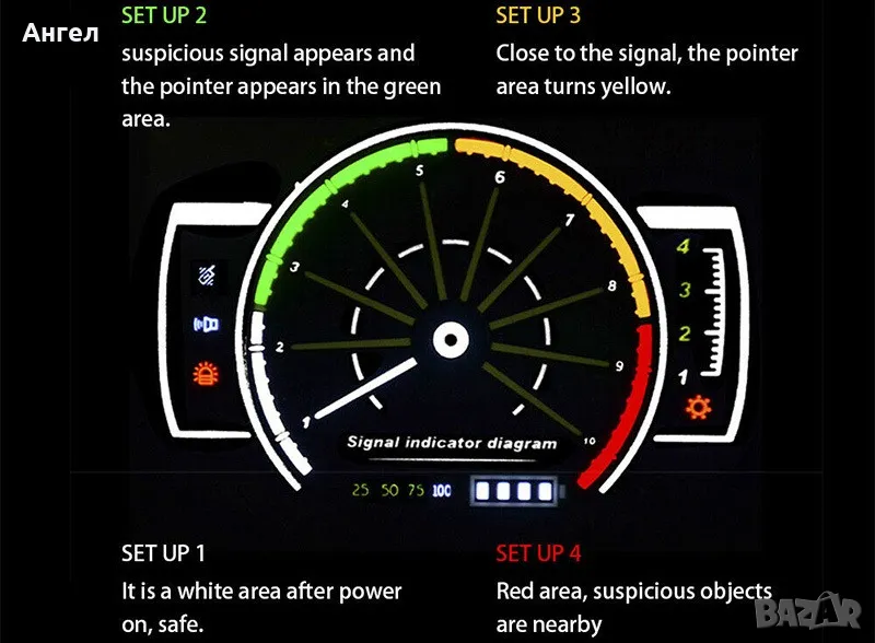 Зона 2: когато се появи подозрителен сигнал, иглата на индикатора се колебае напред-назад в зелената зона и се подава аларма.