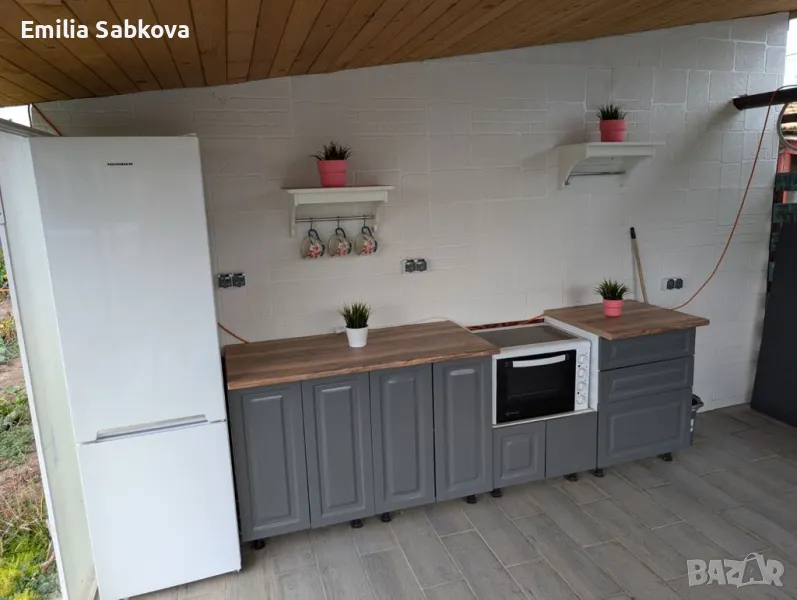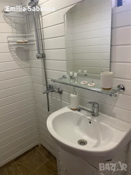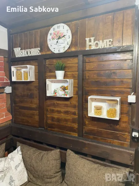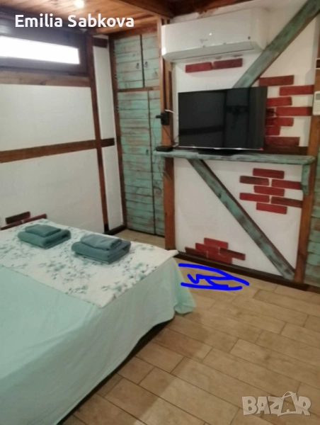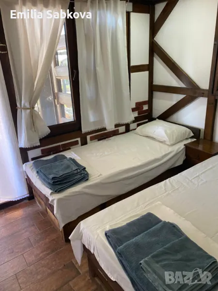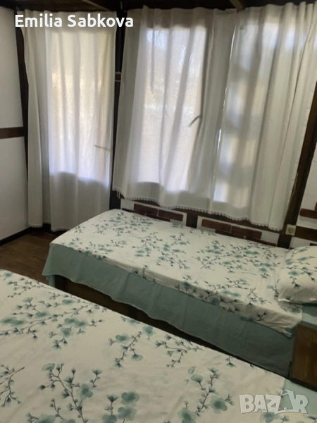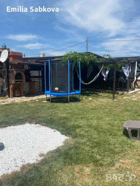 обзавеждане, което е изцяло ръчно изработено от дърво. Помещенията са климатизирани и разполагат с телевизор като едната стая е със спалня 150/200см., втората със спалня 160/200см. а другите две са идентични-легло 120/200см. плюс второ легло 80/200см.Дворът е озеленен, има зона за релакс, барбекю, електрическа скара, огнище с дивани, шезлонги с шалтета, летен душ и батут, където да се забавляват децата, голям сезонен испански басейн с размери 730/375см. Паркирането е свободно в двора и пред къщата.