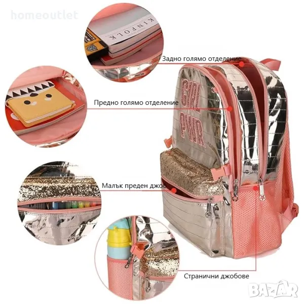 Комплект от 3 части: Голяма раница с размери 43 см х 38 см х 12 см, чанта за обяд 22 см х 10 см х 19 см и малък несесер 24 см х 6,5 см