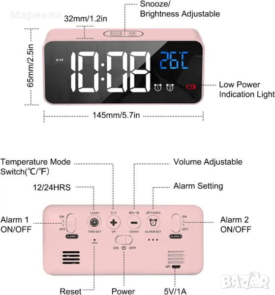 Двойна аларма с функция дрямка. Две аларми означава, че могат да бъдат зададени две отделни времена на алармата. Времето за отлагане може да бъде зададено, няма нужда ръчно да изключвате будилника. Събуждайте се по различно време, направете живота си по-лесен и удобен.