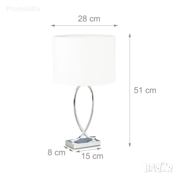 Осветителното тяло Relaxdays 10022850 е с височина 51 сантиметра, диаметър на абажура 28 см и размери на основата 8 х 15 см.