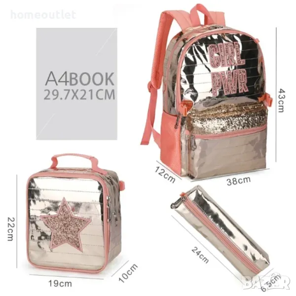 Комплект от 3 части: Голяма раница с размери 43 см х 38 см х 12 см, чанта за обяд 22 см х 10 см х 19 см и малък несесер 24 см х 6,5 см