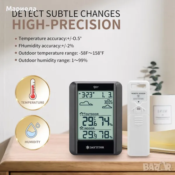 Метеорологичните станции за точност на домашната температура +/-0,5 °, точност на влажността +/-2%, могат точно да показват данни за вътрешна и външна температура и влажност, което ви позволява да разберете промените в околната среда.