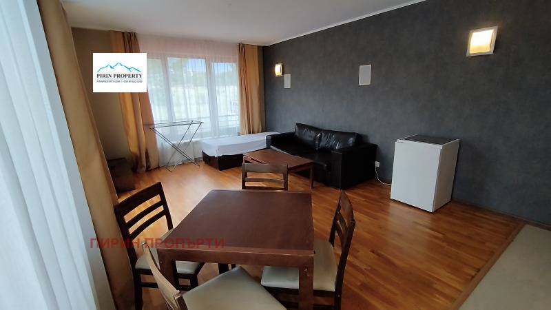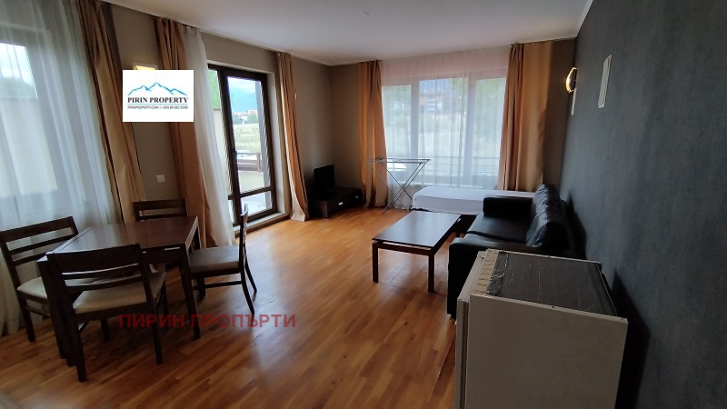 Във всекидневната ще намерите голям PVC разтегателен диван и масичка за кафе. Пространството е осветено от голяма витрина с непрекъсната гледка към Пирин планина на юг, допълнена от пердета и мрежи в цял ръст. От дневната има достъп до обширната тераса. Моля, имайте предвид, че тази част от балкона не подлежи на такси за поддръжка.