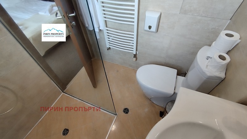 Самостоятелната баня включва душ кабина, WC, мивка с огледало и сушилня за хавлии.