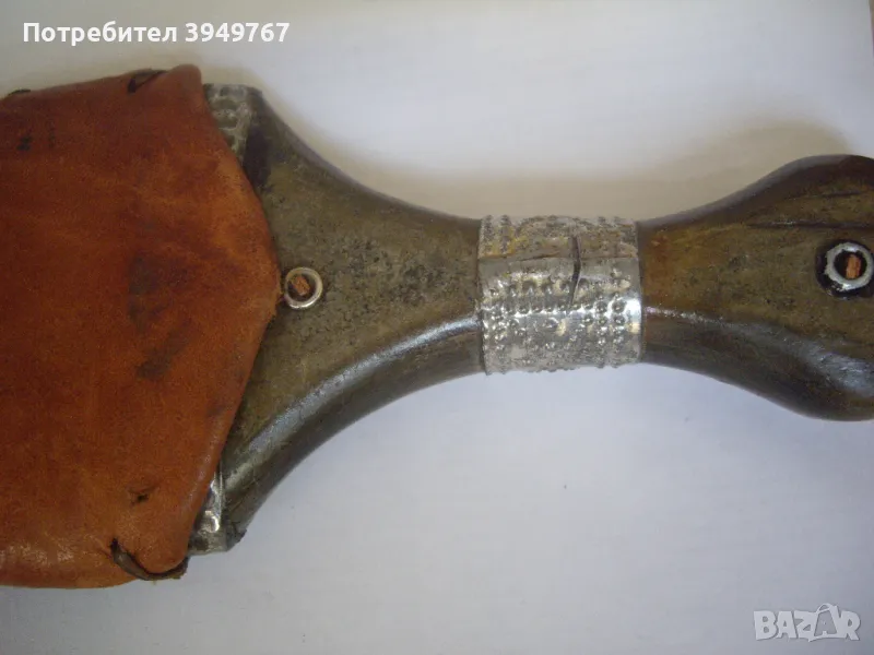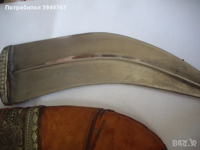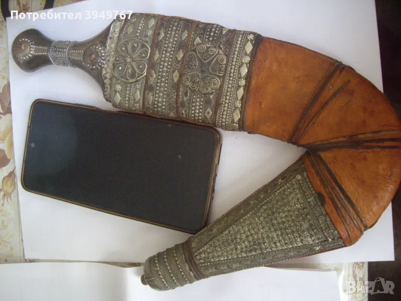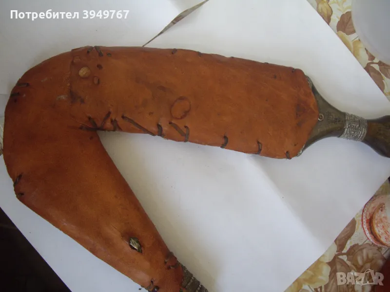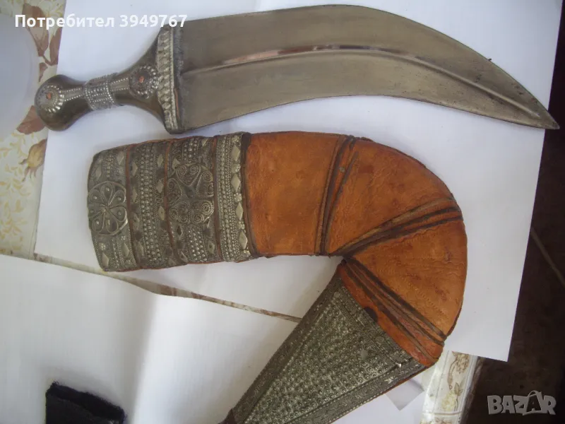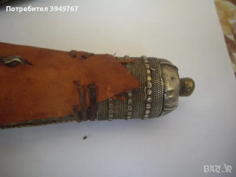 Много добре запазен стар йеменски ханджар.Дръжка от кокал от морж,инкрустирана със сачанени набивки,който за жалост липсват от едната страна на дръжката.Канията е от кожа инкрустирана отново със сачанени набивки.Има две тънки като конец кожички ,които опасват канията ,и те са скъсани от едната страна,но това не играе роля за някаква по-голяма щета по канията,просто са за красота.
