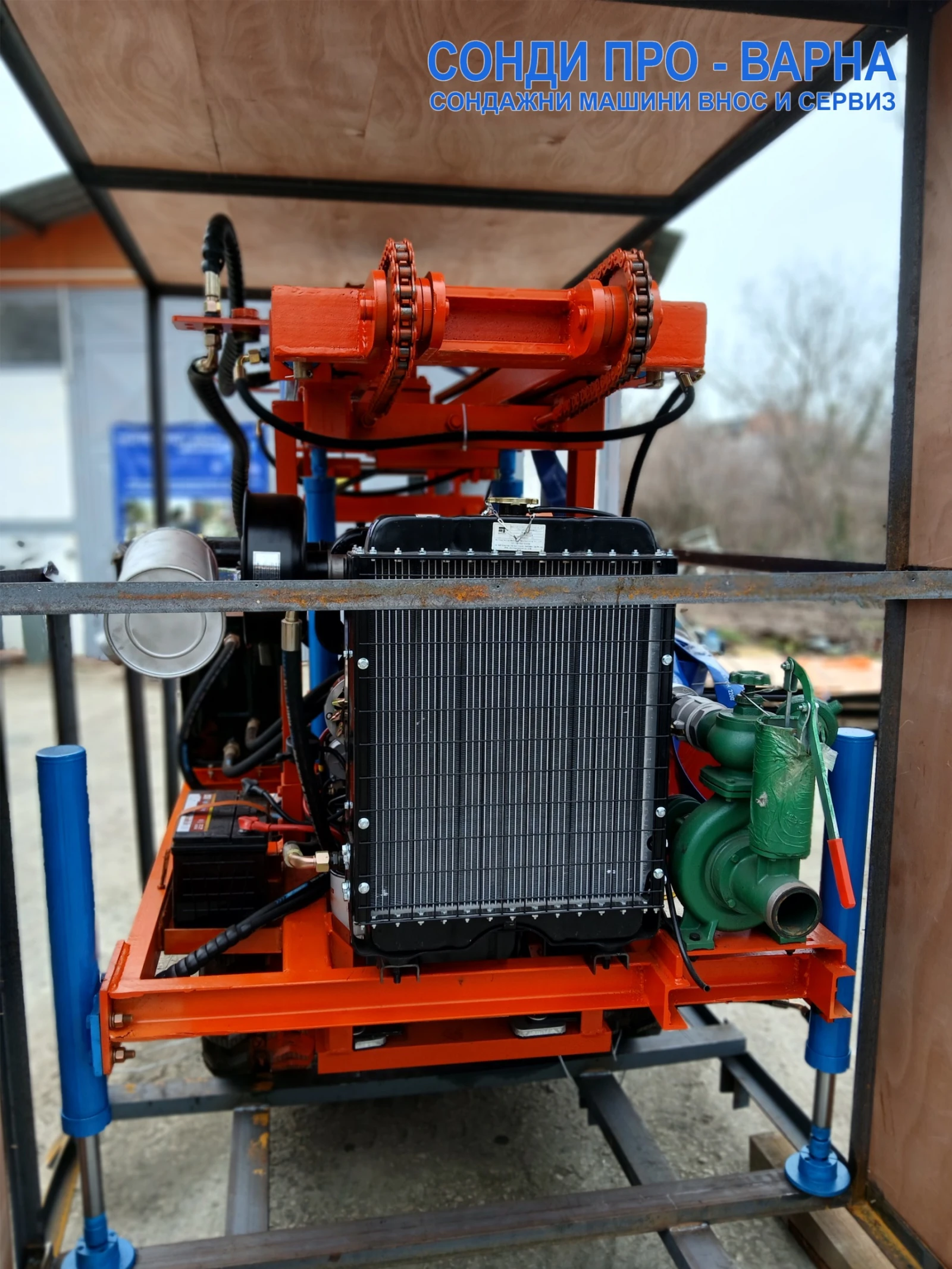 Сондажна машина Track-Pro260ACN (v. 87Н2) до 260 метра /сонда за вода/ . НОВО: НОВА МОДЕРНИЗИРАНА ВЕРСИЯ НА СОНДАЖНА МАШИНА Track-260CN с Дизелов двигател 87HP, ВЕРСИЯ ПРО v. 87Н2! НОВО: ВЕРСИЯ " Air" СПЕЦИАЛНА ОКОМПЛЕКТАЦИЯ САМО ЗА ВЪЗДУШНО СОНДИРАНЕ . - ЗА ВОДНО СОНДИРАНЕ: ЕДИН ХИДРОМОТОР НА СОНДАЖЕН РЕДУКТОР! - ЗА ВОДНО СОНДИРАНЕ: ЕДИН ХИДРОЦИЛИНДЪРА ЗА ВДИГАНЕ НА МАЧТАТА! - НОВО: ВИСОЧИНА НА МАЧТАТА 2000 ММ (ОПЦИЯ 2400 ММ)! - НОВО: НОВ 4-ЦИЛИНДРОВ ДИЗЕЛОВ ДВИГАТЕЛ 87HР С ВОДНО ОХЛАЖДАНЕ ВЪНШЕН РАДИАТОР/МАСЛЕН ОХЛАДИТЕЛ! - НОВО: ЗАДВИЖВАНЕ ПЪЛНА ХИДРАВЛИКА С ОТДЕЛЕН КРЪГ НА ГЛАВНАТА ХИДРАВЛИЧНА ПОМПА - НОВО: (ЗА ВОДНО СОНДИРАНЕ ДО 50 МЕТРА): ЦЕНТРОБЕЖНА ПОМПА ЗАДВИЖВАНА ОТ ДВИГАТЕЛЯ . Основно Предназначение (1): Водно сондиране /Сондиране с водно промиване/ до 240-260 метра Основно Предназначение (2): Въздушно сондиране /Пневмо-ударно сондиране/ до 150-160 метра . Цената е с ДДС и гаранция 12 месеца*/*! (1) Производство и доставка по поръчка до 90 дена морско навло от Китай: (вижте цената посочена в обявата) лева с ДДС (2) Производство и доставка по поръчка до 40 дена жп навло с влак от Китай: + 6000 лева с ДДС валидна до 15. 09. 2024, актуална цена само при запитване на спедитор. . /*/Гаранция 12 месеца при изпълнение на Опция (5) Техническо обслужване от Ремтехстрой Груп или от оторизиран сервизен център. /**/Гаранция 6 месеца при неизпълнение на Опция (5) Техническо обслужване от Ремтехстрой Груп или от оторизиран сервизен център. . . - За повече яснота и начин на ползване на Мобилна сондажна машина Track-260CN, моля заредете видеото на адрес: www. youtu. be/OGa-mS-Cqvk - Други модели сондажни машини предлагани от Сонди Про-Варна, може да видите в mobile. bg: tamper. mobile. bg - Друго предлагано ново индустриално оборудване внос от Европа предлагано от РЕМТЕХСТРОЙ ГРУП може да видите на адрес: www. remtechstroy. eu/bg . ХАРАКТЕРИСТИКА: ЗАДВИЖВАНЕ: ДИЗЕЛОВ 87НP (65KW) с електрически стартер. 4 цилиндров. ОХЛАЖДАНЕ: ВОДНО ОХЛАЖДАНЕ С ВЪНШЕН РАДИАТОР МАСЛЕН ОХЛАДИТЕ ОТДЕЛЕН: ДА МАСЛЕН ОХЛАДИТЕЛ КЪМ ВОДНИЯТ РАДИАТОР: ДА ЗАДВИЖВАНЕ ШАСИ: от основният двигател САМОХОДНО ШАСИ С ГУМЕНИ ВЕРИГИ ТЕГЛО: 2500 КГ . ТЕХНИЧЕСКИ РЕАЛНИ ПАРАМЕТРИ НА СОНДИРАНЕ МАКСИМАЛЕН ДИАМЕТЪР НА ПРОБИВАНЕ: 80 - 400 ММ . ВОДНО СОНДИРАНЕ (WATER FLUSH) ДИАМЕТЪР НА ОТВОРА - РЕАЛНО ПОСТИЖИМА МАКСИМАЛНА ДЪЛБОЧИНА 80 - 100 ММ → ≈ 180 - 220 М 100 - 150 ММ → ≈ 120 - 160 М 150 - 200 ММ → ≈ 90 - 130 М 200 - 300 ММ → ≈ 60 - 90 М 300 - 400 ММ → ≈ 30 - 60 М . ВЪЗДУШНО СОНДИРАНЕ (СУХ МЕТОД С МОЩНИ КОМПРЕСОРИ И ПНЕВМОУДАРНИК) ДИАМЕТЪР НА ОТВОРА - РЕАЛНО ПОСТИЖИМА МАКСИМАЛНА ДЪЛБОЧИНА 80 - 100 ММ → ≈ 60 - 100 М 100 - 150 ММ → ≈ 40 - 70 М 150 - 200 ММ → ≈ 25 - 50 М . СОНДИРАНЕ ЧРЕЗ ШНЕК (СУХ МЕТОД) ДИАМЕТЪР - РЕАЛНО ПОСТИЖИМА МАКСИМАЛНА ДЪЛБОЧИНА 80 - 150 ММ → ≈ 30 - 50 М 150 - 300 ММ → ≈ 10 - 35 М . . ВИСОЧИНА НА МАЧТА: 2, 0 М ХИДРАВЛИЧНИ ОПОРИ: 0, 7 M ГАБАРИТ: Дължина=2200 х Широчина=1400 х Височина=2200 ММ . ХИДРАВЛИКА: Помпа Hydraulic CN ВЪРТЯЩ МОМЕНТ НА ГЛАВАТА: 5500-8500* Nm БРОЙ ХИДРОМОТОРИ: 1 БРОЙ (ОПЦИЯ: 2 БРОЯ) БРОЙ ХИДРОЦИЛИНДРИ: 2 БРОЯ СКОРОСТ НА ВЪРТЕНЕ: 38-80 об/мин СКОРОСТ НА ПРОБИВАНЕ: 90-160 мм/час . СОНДАТА Е С ПЪЛНО ХИДРАВЛИЧНО УПРАВЛЕНИЕ - сила на притискане: до 14* тона! - теглителна сила: до 14** тона, два хидроцилиндъра общо усилев-14 тона! */** Съгласно спецификация на завода производител. - мачта се прибира с хидравлика . ВОДНО ПРОМИВАНЕ: ДА ВГРАДЕНА ВОДНА ПОМПА: ДА, КАЛНА ПОМПА WD160 МОЩНОСТ НА ПРЕДВИЖВАНЕ: 10HP ДЪЛЖЕНА НА МАЧТА/ХОД: 2000 ММ ДВЕЖЕНИЕ ПРЕСЕЧЕНА МЕСТНОСТ: ДО 25 градуса СКОРОСТ НА ПРЕДВИЖВАНЕ: 2. 5 КМ/Ч РАБОТНО НАЛЯГАНЕ Х
