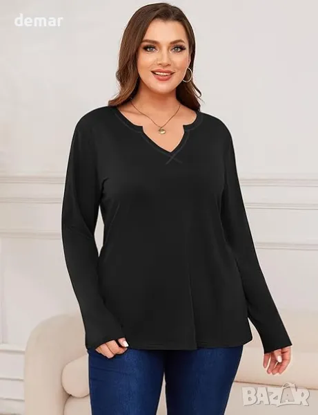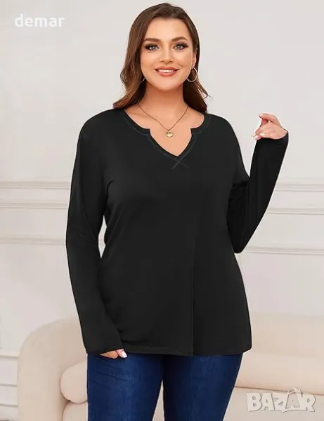 Тази дамска тениска с голям размер с дълъг ръкав се отличава с V-образно деколте с видими кръстосани шевове, предлагащи нотка елегантност. Изработена от лека и дишаща полиестерна и изкуствена коприна, тя осигурява удобна, свободна кройка в размер 3XL, което я прави подходяща за различни типове фигура. Тя е идеална за напластяване или самостоятелно носене, идеална както за дома, така и за работа. Дължината й до горната част на бедрото се съчетава добре с клин или дънки, а стилът с V-образно деколте създава илюзията за по-дълъг врат и по-висок външен вид.