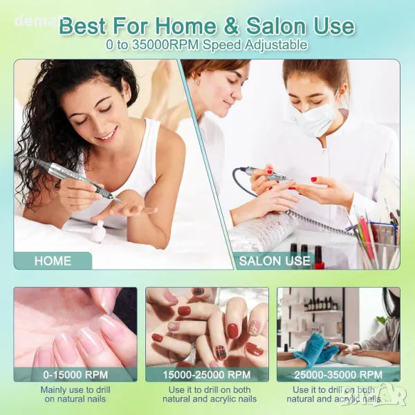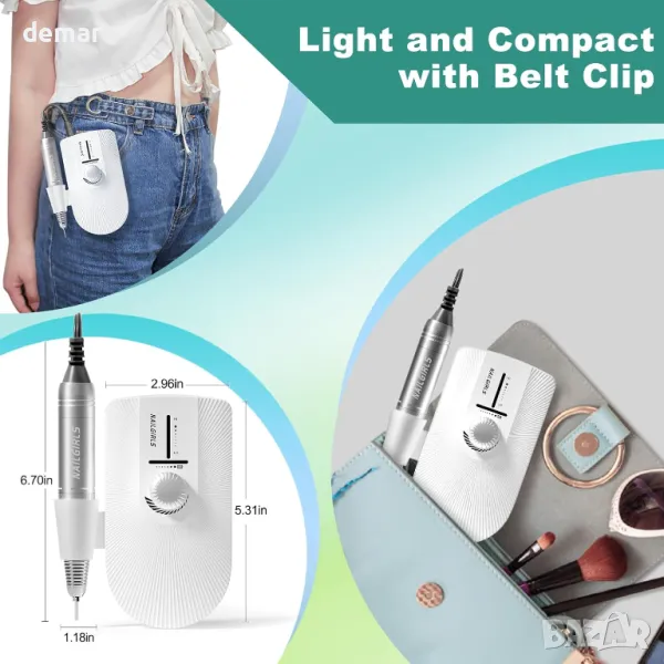 Професионалната пила за нокти се характеризира с ниски вибрации, нисък шум и гладка работа, изработена от лека алуминиева сплав с уникален метален блясък и вентилация за предотвратяване на натрупване на топлина. Включва щипка за лесно закрепване към колани или джобове, което я прави идеална за употреба в салон, у дома или при пътуване. Презареждаемият, безжичен дизайн предлага 6-8 часа употреба след само 2 часа зареждане и може да се удвои като временна захранваща банка. С мощен мотор, регулируем до 35 000 оборота в минута, тя лесно се справя с премахването на акрил и гел лак. Пилата е подходяща както за десни, така и за левичари, с превключвател напред/назад и лесна смяна на накрайниците. Комплектът включва електрическа пила за нокти, дръжка, 11 свредла, 56 шлифовъчни ленти, ръководство за потребителя и кабел за зареждане Type-C, което го прави идеален подарък за любителите на ноктопластиката.