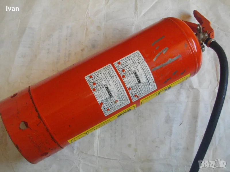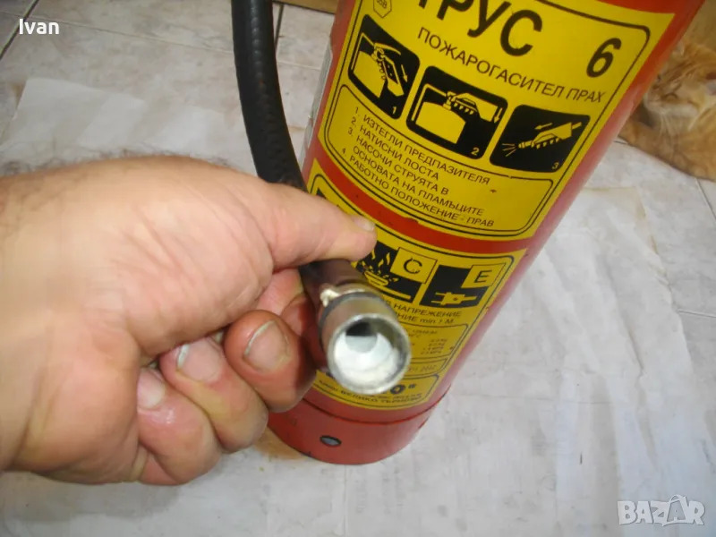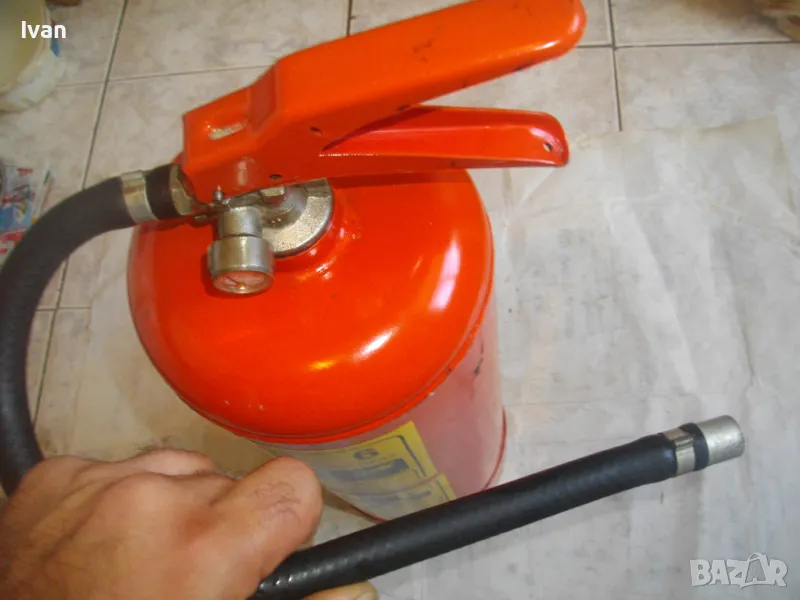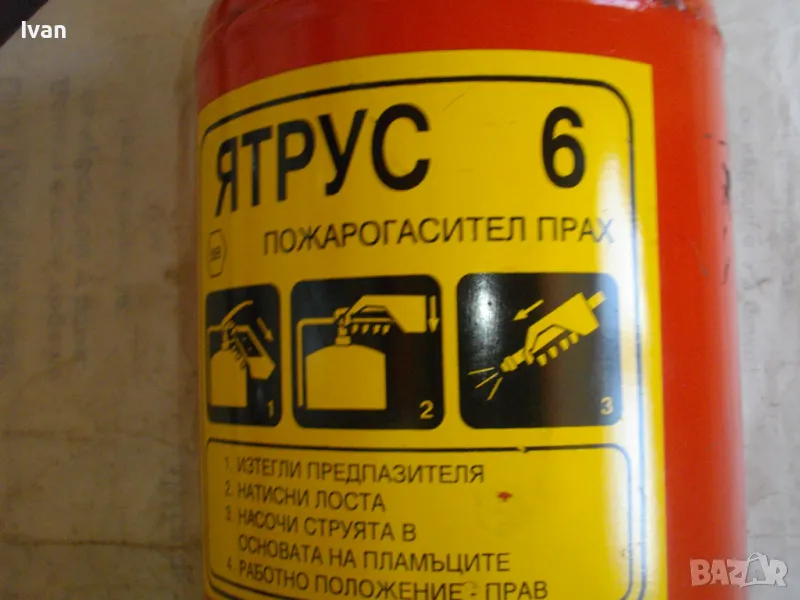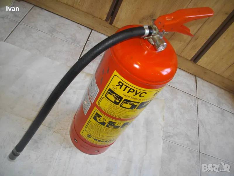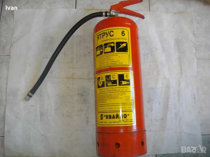 пожарогасител ЯТРУС 6 - цена 89 лв. Българско производство 2001г. С манометър за налягането. Праховият пожарогасител 6 кг. АВС е най-разпространеният пожарогасител, предписван от органите по пожарна безопасност. Подходящ е за всички обекти с площ до 100 м2. съгласно забележка 7 от Приложение 2 към Наредба № Iз-1971 от 29.10.2009 г. Празен, без прахово вещество. Почти нов, масивен, в отлично работно съсотяние. Трбва да се напълни и завери с контролен стикер. За 6 кг прахово вещество пра тип АВС или тип ВС. Размери: височина - 540 мм, диаметър ф 160 мм. Тегло празен - 4,0 кг. Тегло както е с главата спусък и маркуча - 6,0 кг. Работно налягане 1,4 Мра, пробно наляггане 2,5 МРа. Маркуч в отлично състояние, без нацепване и напукване. Подходящ за всякакви търговски площи и обекти , заведение, клиники, помещения, офиси и др. Масивен, плътно желязо.