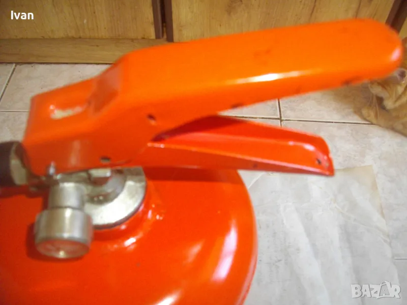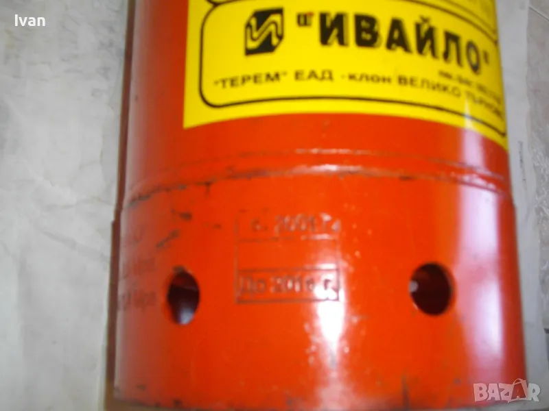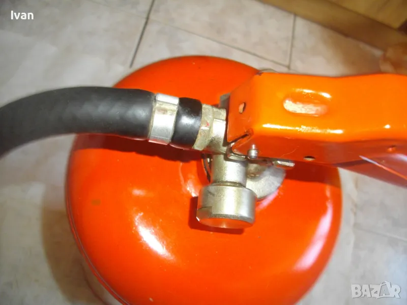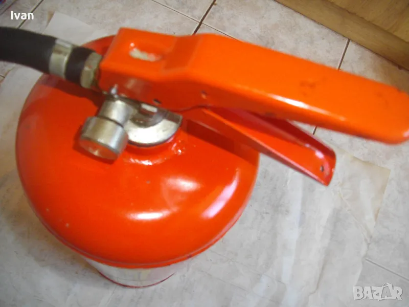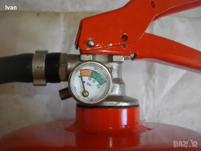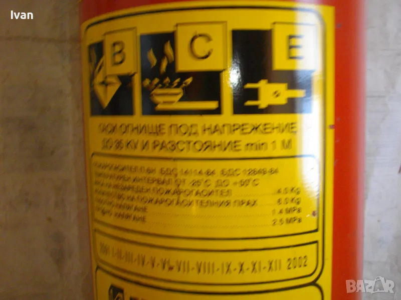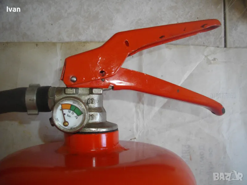 пожарогасител ЯТРУС 6 - цена 89 лв. Българско производство 2001г. С манометър за налягането. Праховият пожарогасител 6 кг. АВС е най-разпространеният пожарогасител, предписван от органите по пожарна безопасност. Подходящ е за всички обекти с площ до 100 м2. съгласно забележка 7 от Приложение 2 към Наредба № Iз-1971 от 29.10.2009 г. Празен, без прахово вещество. Почти нов, масивен, в отлично работно съсотяние. Трбва да се напълни и завери с контролен стикер. За 6 кг прахово вещество пра тип АВС или тип ВС. Размери: височина - 540 мм, диаметър ф 160 мм. Тегло празен - 4,0 кг. Тегло както е с главата спусък и маркуча - 6,0 кг. Работно налягане 1,4 Мра, пробно наляггане 2,5 МРа. Маркуч в отлично състояние, без нацепване и напукване. Подходящ за всякакви търговски площи и обекти , заведение, клиники, помещения, офиси и др. Масивен, плътно желязо.