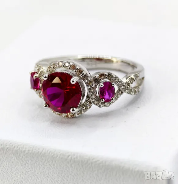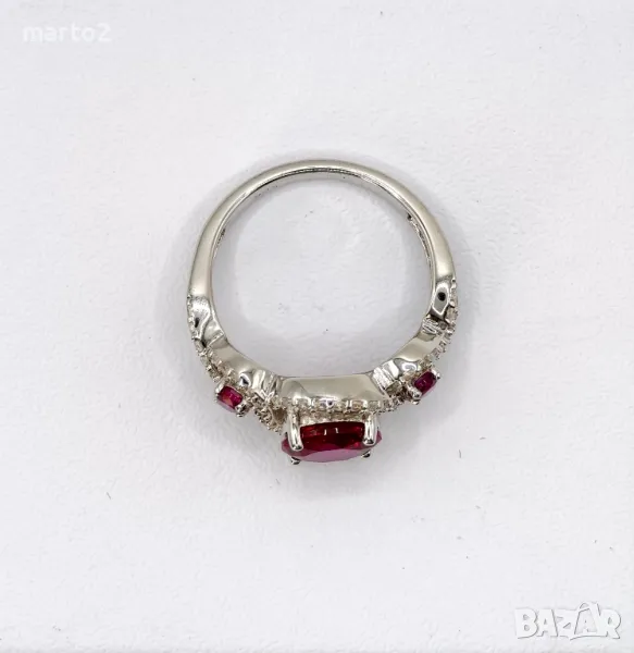 Прекрасен Сребърен 925 Пръстен с Родиево покритие и Лабораторни Рубини и Циркони! → Обява 47112517