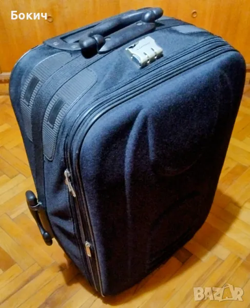 Продава употребяван, мек (платнен) куфар, среден, с размери: 65/40/27-33 cm (Вис./Шир./Дебел.) с разширител, едноцветен/черен с 2 колела ф4 cm. С функционираща телескопична дръжка и пластмасова заключалка с код, която наскоро не издържа на напрежението и се счупи. Това е и единствения му дефект. Циповете и техните машинки и дръжки са здрави и изправни. Куфарът е закупен от Метро К&К преди 5 години.