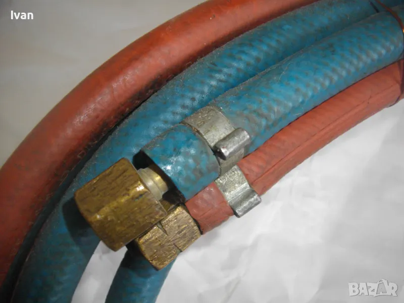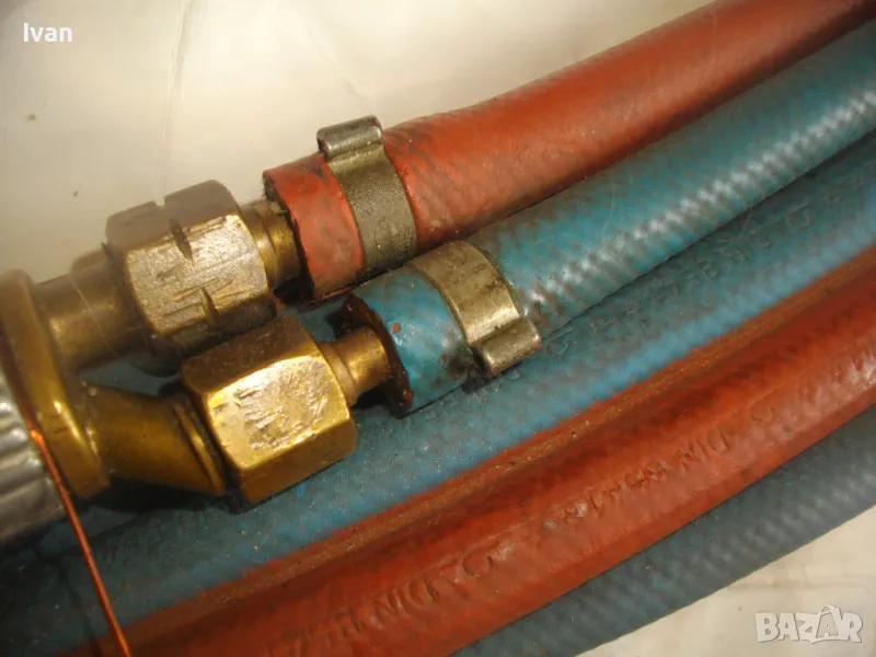 Щуцери на бренера - брнзови старо качество. Скачени 2 бр. оригинални маркучи дебели за голям дебит/налягане. Присъединителни резбови бронзови адаптери с въртящи се гайки размер М 14 за скачване от другата страна на маркучите. Дължина на всеки от двата маркуча - 10 м. Отлично състояние на маркучите - без никкви напуквания.