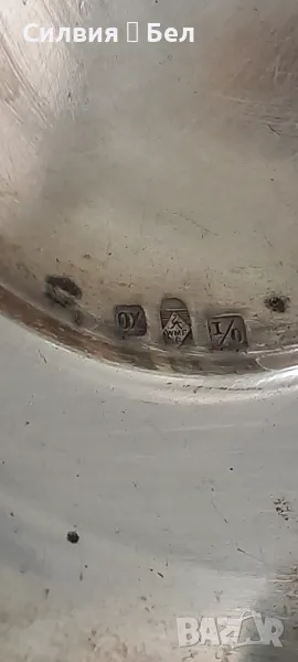 'WMF' с щраус, ref. използван от 1900 г. до приблизително 1918 г.; „£“ означава Британия, а именно метал на базата на цинк, антимон и мед, който служи като основен метал за сребърно покритие; продукт, произведен за износ за френския пазар в годините 1909 - 1914 г.