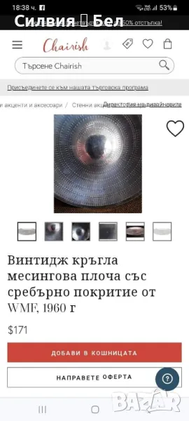 WMF BRASS. Плитка купа/ чиния. Месинг със сребърно покритие. Авторска изработка от 60-- те години. Германия. Цена 9️⃣0️⃣лв.🌹..•´¨) ¸.•¨)🌱... (¸.•¨¯`*•.🍃🌹🍃