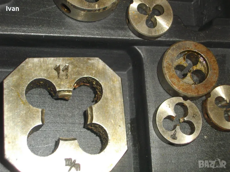 12 броя плашки за външни резби, рзлични размери - 1/8, 15 мм, 16 мм, 10 мм, 11 мм, М10 и други. По плашките се четат професионалните френски марки: