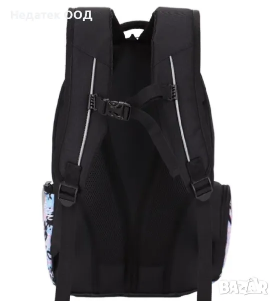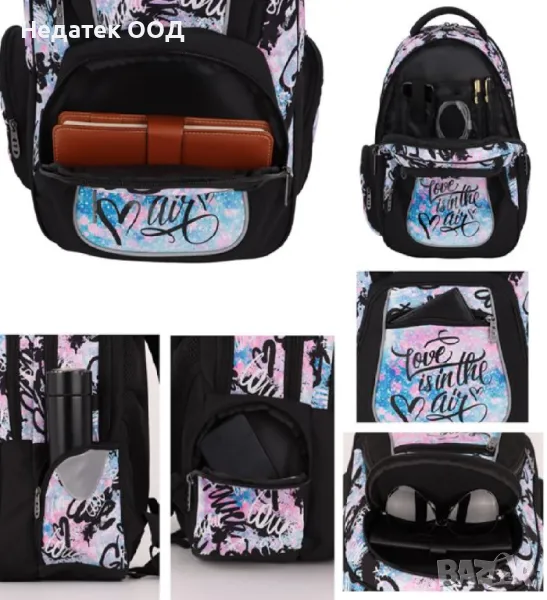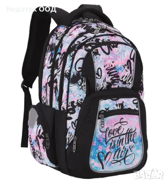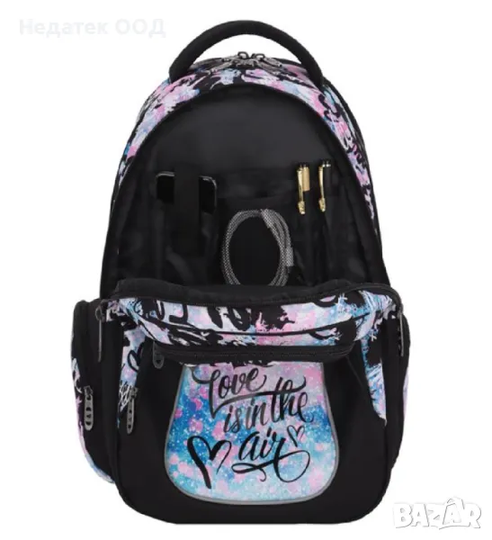 Ученическа раница с пъстра шарка в бледи цветове, черни детайли и послание "Love is the air". Има 3 джоба със здрави ципове и метални закопчалки и 2 странични джоба за монети с цип. Голямо подсилено отделение за лаптоп, интегрирано в основното отделение. Има организиращ джоб, отвор за лесно свързване на слушалки, място за съхранение на очила в предния джоб и светлоотразителни ленти от всички страни. С анатомичен гръб, ергономични презрамки, дръжка и качествено водоустойчиво дъно.