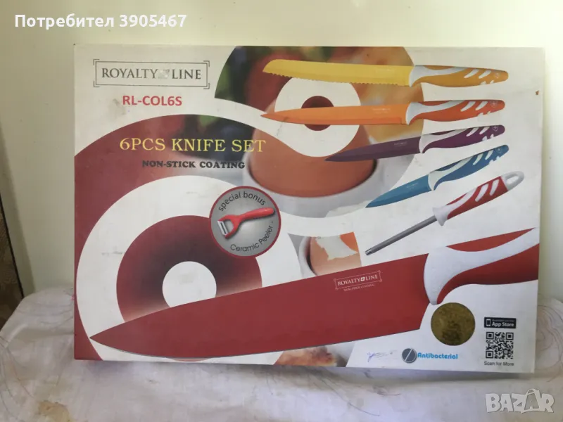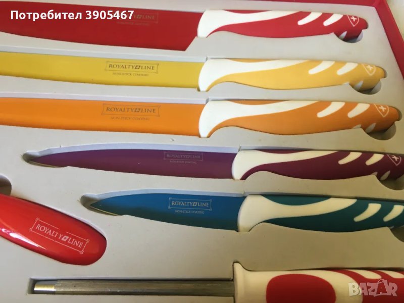 Комплекта е чисто нов, както се вижда връхчетата на ножовете са с предпазители. Луксозно изпълнение . 5 ножа, 1 уред за заточване и една белачка /според мен/. Royalty line. Чест за всяко домакинство. Кутията е здрава,дебела но и красива и се затваря с вграден магнит. Има и книжка с обяснения.