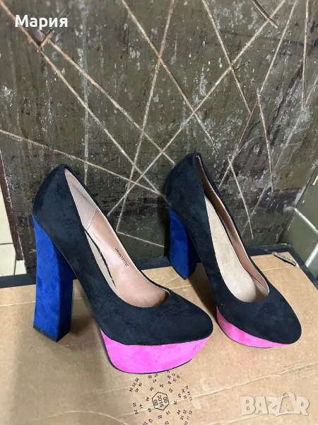Дамски велурени обувки на ток черно, синьо и розово → Обява 47122136