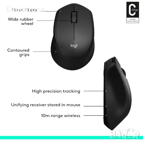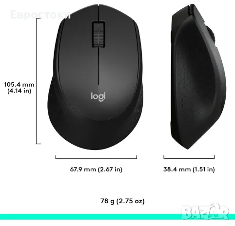 Безжична мишка Logitech M330 Silent, 2,4 GHz USB приемник, оптично проследяване, цвят: черно.