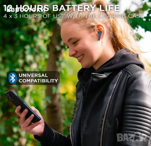 Дълготрайна автономност + универсална съвместимост. С безжичните слушалки BE POP се насладете на 3 часа непрекъснато възпроизвеждане. Благодарение на калъфа за зареждане, можете да презареждате своите безжични Bluetooth слушалки BE POP 4 пъти за максимална автономност от 12 часа употреба. Калъфът може да се презареди напълно само за 2 часа. Технологията Bluetooth 5.1 позволява съвместимост с всички марки смартфони с Android и iOs.