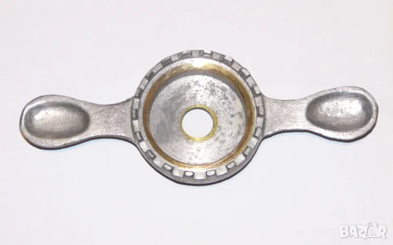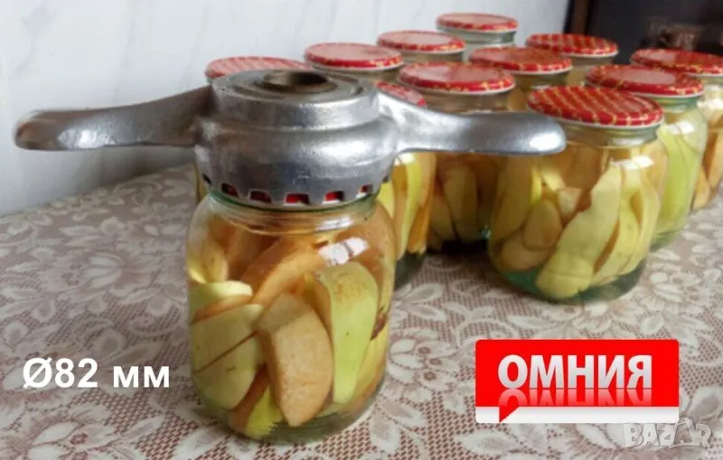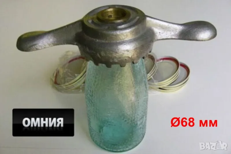 Заводско производство по БДС комбинирана тройна ръчна ЗАТВАРАЧКА за БУРКАНИ тип ОМНИЯ Ø68(0,800 л) и Ø82(0,400, 0,800 и 3 литра) мм и БУТИЛКИ тип Кроненкорк Ø26(от 250 мл до 1 литър) мм. Изцяло метална конструкция с прецизна машинна изработка - с 2 дръжки, реверсивна с 3 работни профила: външен многозъб профил за Ø82 мм, вътрешна месингова гривна за Ø68 мм и горен месингов пръстен за Ø26 мм.